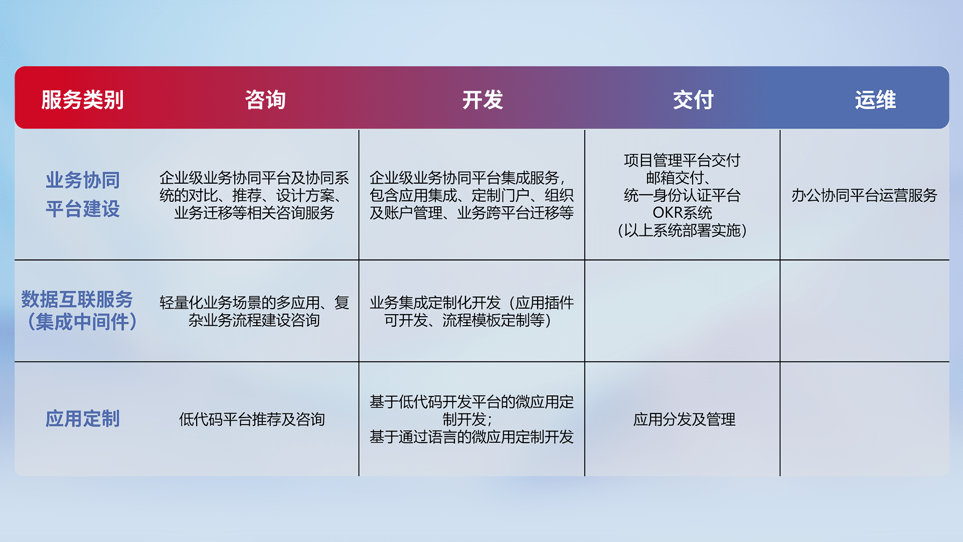 针对钉钉、、、企微、、IDaas等平台级产品提供产品的规划、、、、方案、、、交付、、、定制化开发等服务,,实现如统一协同办公、、智能客户服务、、混合会议管理、、、、智能数据查询、、、等业务场景,,实现数字化转型。。