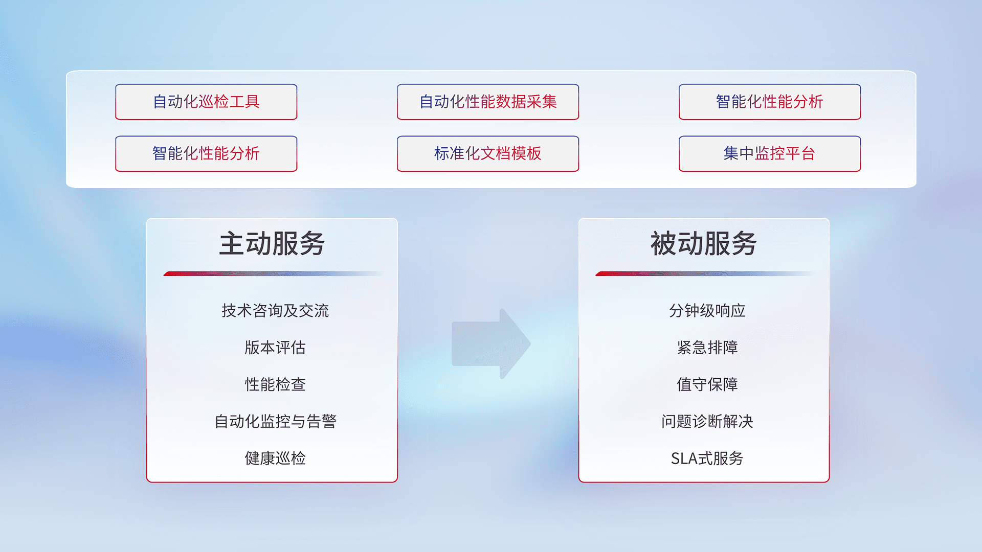 智能化工具和标准化文档,,保障服务质量,,,,提供主动服务(包含技术咨询、、、版本评估、、、、性能检查、、、、自动化监控与告警、、、、健康巡检)和被动服务包含(分钟级响应、、、紧急排障、、值守保障、、、、问题诊断解决、、、、SLA服务)。。