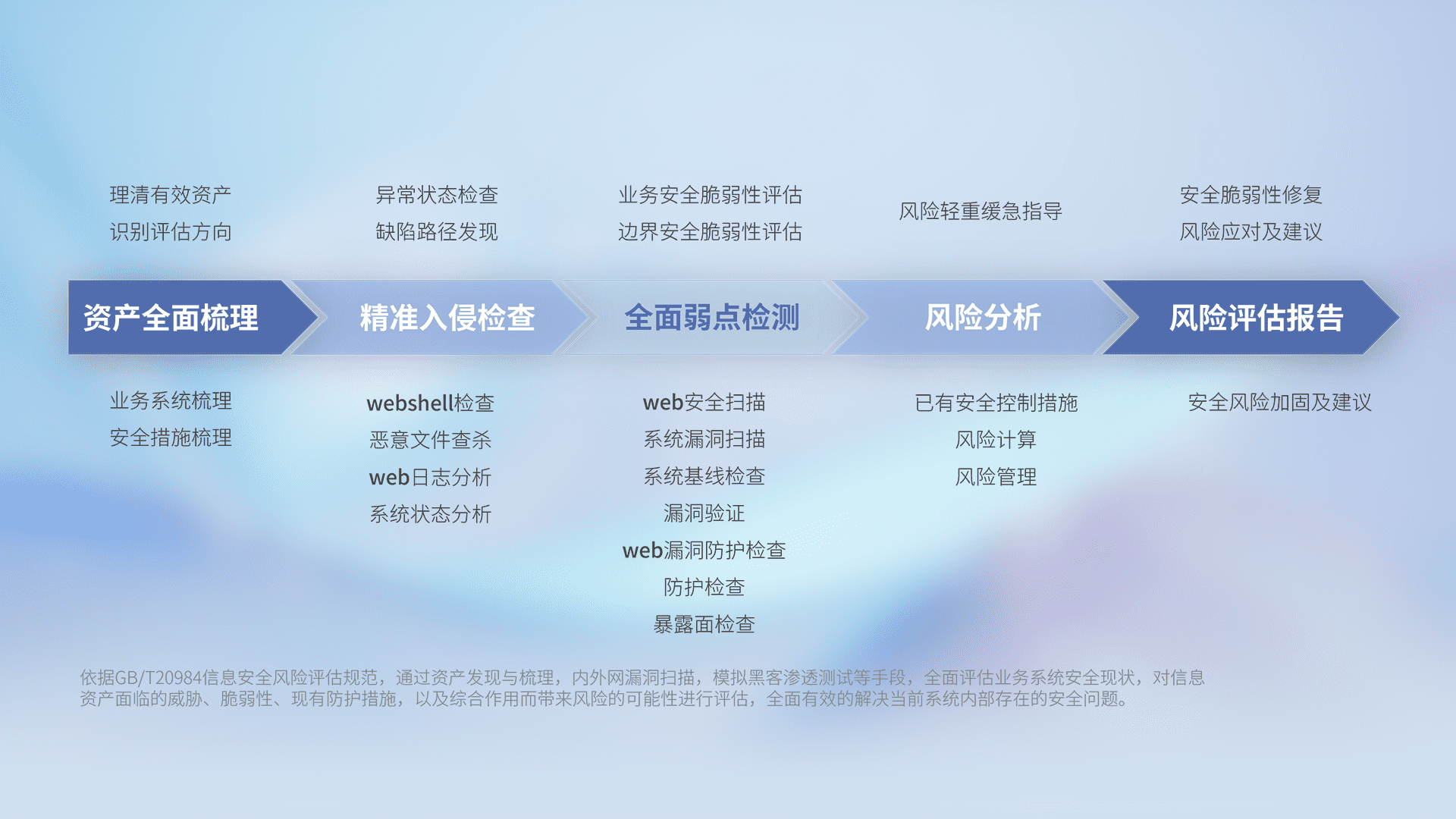 针对客户行业特性,,以专业的安全服务+多厂商联合解决方案提供专属的一站式安全管理服务,,帮助客户全面感知网络空间威胁,,,,基于识别、、、、检测、、、、分析、、防护、、、监测、、响应的服务理论模型,,,,从方案咨询、、、集成交付、、评估验证、、、优化加固、、运维运营,,,致力于为客户提供完整的闭环管理式安全服务。。。。以实战经验为客户打造高抵御风险的安全体系,,,帮助客户发现威胁、、、对抗威胁、、、、处置威胁,,不断积累安全对抗能力,,,持续保障数字化安全。。。。